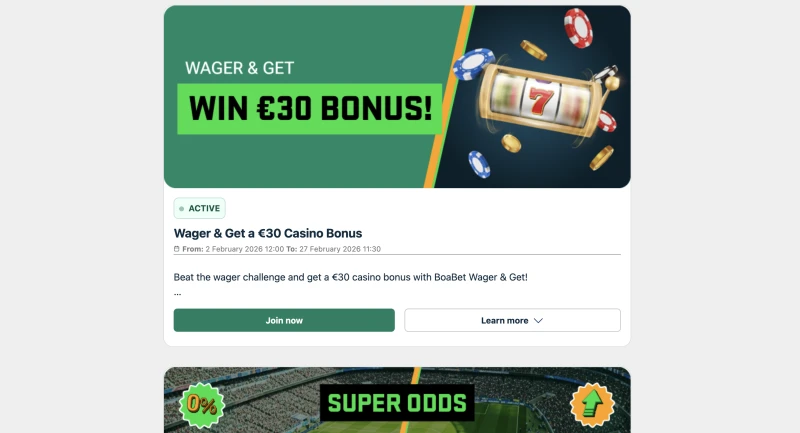 Vi kjĂžrer kampanjer for bĂ„de casino og sport, med enkle mĂ„l du kan spore fra profilen din. I Boabet Casino kan casinospillere bli med pĂ„ âWager & Getâ ved Ă„ omsette 5000 NOK pĂ„ spilleautomater eller live casino for Ă„ motta en 300 NOK bonus. Sportsspillere kan bruke Multi Bet Bonus-funksjoner som Ăžker gevinster pĂ„ kombinasjonsspill med 3+ valg, og du kan ogsĂ„ tjene belĂžnninger gjennom vĂ„rt henvisningsprogram.